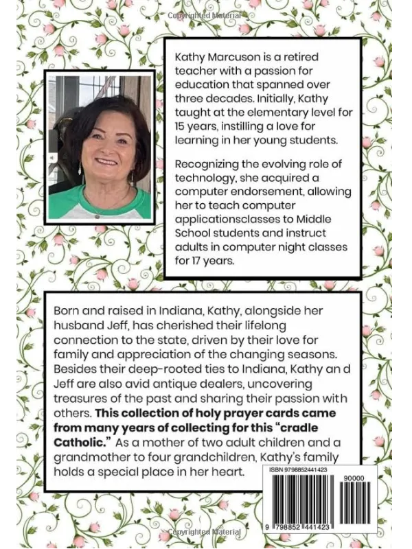 Born and raised in Indiana, Kathy, alongside her husband Jeff, has cherished their lifelong connection to the state, driven by their love for family and appreciation of the changing seasons. Besides their deep-rooted ties to Indiana, Kathy and Jeff are also avid antique dealers, uncovering treasures of the past and sharing their passion with others. This collection of holy prayer cards came from many years of collecting for this “cradle Catholic”. As a mother of two adult children and a grandmother to four grandchildren, Kathy’s family holds a special place in her heart.